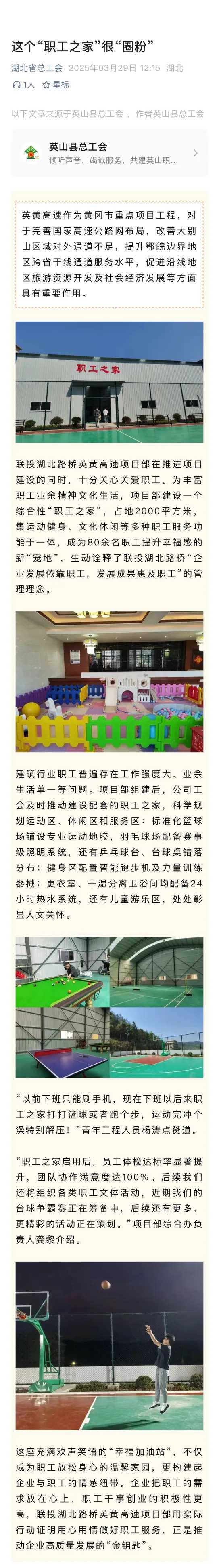 联投澳门博彩官网下载英黄高速项目部在推进项目建设的同时,十分关心关爱职工。为丰富职工业余精神文化生活,项目部建设一个综合性“职工之家”,占地2000平方米,集运动健身、文化休闲等多种职工服务功能于一体,成为80余名职工提升幸福感的新“宠地”,生动诠释了联投澳门博彩官网下载“企业发展依靠职工,发展成果惠及职工”的管理理念。近日,湖北省总工会进行深入报道,全文如下: