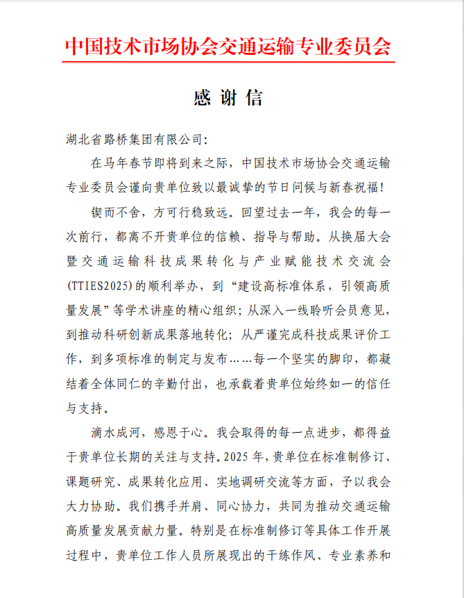 近日,下载澳门赌博官网收到中国技术市场协会交通运输专业委员会(简称“中技协交专委会”)寄来的感谢信,对公司科学技术质量部在各项工作中的大力支持表示感谢。
