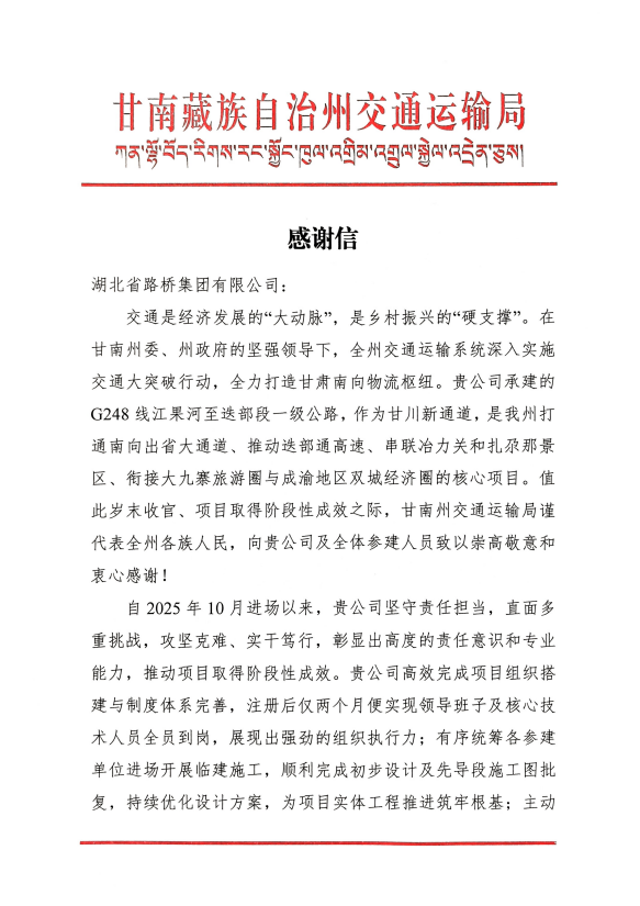 甘南藏族自治州交通运输局近日发来感谢信,对下载澳门赌博官网承建的G248线江果河至迭部段一级公路项目取得的阶段性成效给予高度肯定与诚挚赞誉。