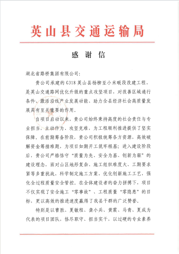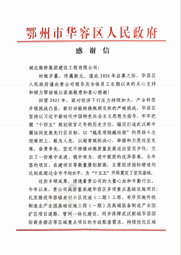 鄂州市华容区人民政府发来感谢信,对湖北省路桥建设工程有限公司承建的华容区多项重点基础设施项目的高质量推进给予高度肯定与诚挚赞誉。