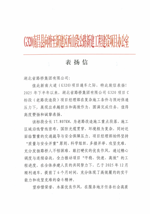 G320南昌县向塘至新建区西山段公路新建工程C标段(老路改造段)项目收到一封来自南昌市公路事业发展中心的表扬信,对项目团队在复杂施工环境与严格的限时保通双重压力之下,提前6个月完成建设任务的非凡勇气、务实作为与坚韧担当,给予了高度评价与赞美。